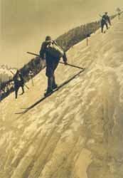Ältestes Torlauf-Bild (19.3.1905). Zdarsky demonstriert, wie zwei nebeneinander stehende Fahrmale (Tore) mit einem Bogen genommen werden (Gestellte Aufnahme) |